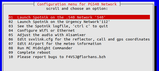 #!/bin/bash # Selection menu for Spotnik-v2.00en PG540 Network # # F5NLG 11/12/2017 origine # F4VSJ 13/03/2018 english translation # 30/03/2018 modifications for 540 network # 28/04/2018 mods after live test mwl # 15/07/2018 V2.00en # # while : ; do choix=$(whiptail --title "Configuration menu for PG540 Network" --menu " scroll and choose an option:" 33 69 25 \ 01 " Launch Spotnik on the .540 Network '540'" \ 02 " Launch Spotnik on the Urgency Network'112'" \ 03 " See the Spotnik logfile, 'ctrl c' to quit" \ 04 " Configure Wifi or Ethernet " \ 05 " Adjust the audio with Alsamixer" \ 06 " Edit svxlink.cfg for the reflector, call and gps coordinates" \ 07 " Edit Airport for the meteo information" \ 08 " Run MC Midnight Commander" \ 09 " Configure the SA818 Spotnik Delta module" \ 10 " Complete reboot" \ 11 " Please report bugs to F4VSJ@florhans.bzh" 3>&1 1>&2 2>&3) exitstatus=$? #on recupere ce choix #exitstatus=$? if [ $exitstatus = 0 ]; then echo "Your chosed option:" $choix else echo "You chosed Cancel."; break; fi # case : action en fonction du choix case $choix in # .540 Network 01) /etc/spotnik/restart.540 ;; # Urgency Network 02) /etc/spotnik/restart.112 ;; # view svxlink.log 03) /etc/spotnik/view_svx ;; # config wifi, ehternet 04) nmtui ;; # sound adjust 05) alsamixer && alsactl store ;; # edit svxlink.cfg 06) mcedit /etc/spotnik/svxlink.540 ;; # edit airport ModuleMetarInfo 07) mcedit /etc/spotnik/svxlink.d/ModuleMetarInfo.conf ;; # run midnicght commander 08) mc /etc/svxlink ;; # 818 prog 09) 818-prog ;; # reboot 10) reboot ;; # report bugs 11) echo report bugs to: f4vsj@florhans.bzh esac done exit 0